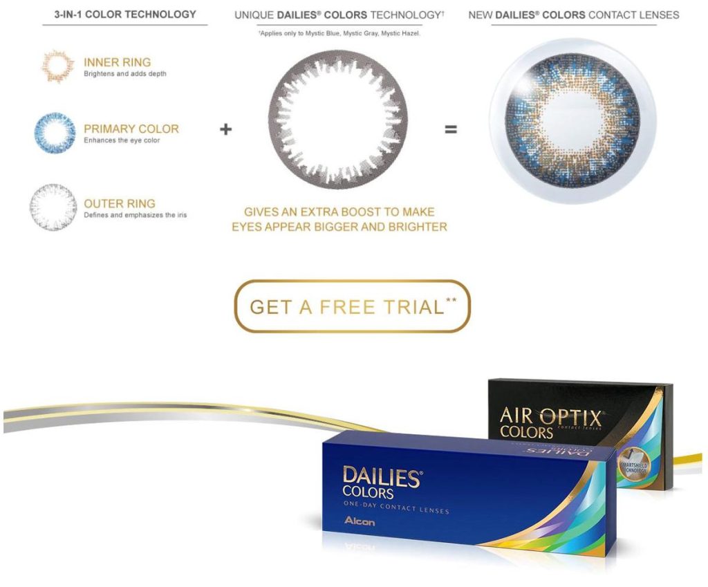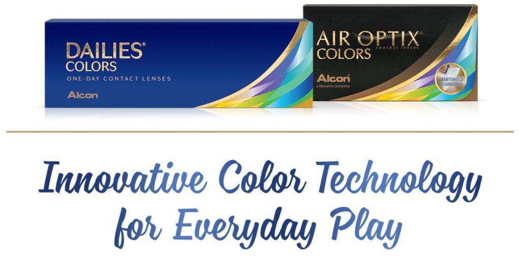 DAILIES® COLORS and AIR OPTIX® COLORS contact lenses each feature 3-in-1 Color Technology, which blends with your eye color to provide a beautiful, natural appearance